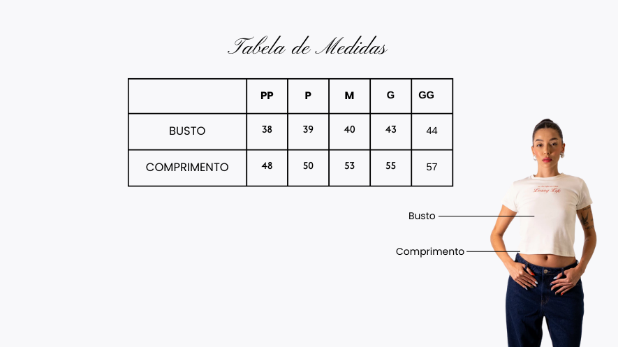 A Baby Tee Living Life é uma peça delicada e costurada a mão por mulheres.