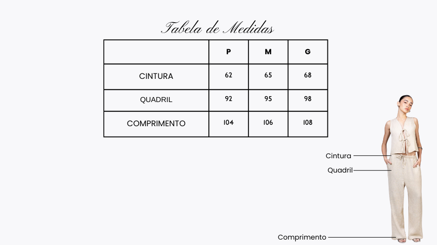 A Calça Dream Texturizada é aquela peça que eleva qualquer look sem esforço, perfeita pra quem busca personalidade, conforto e uma modelagem que valoriza o corpo com leveza. Ela possui cós com elástico e amarração, garantindo ajuste perfeito! A textura sutil e elegante do tecido traz movimento e um toque fashion que faz toda diferença na produção!
