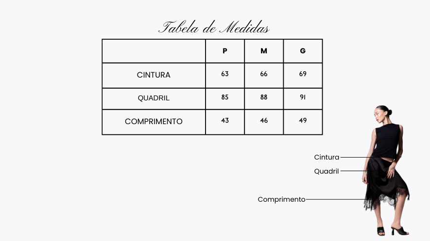 A Saia Jade é aquele tipo de peça que muda completamente o mood do look, feminina sofisticada e com aquele toque delicate glam que deixa qualquer produção irresistível! Com caimento fluido e acabamento acetinado, ela traz barra em renda trabalhada, que cria movimento e dá um charme único à peça. Na frente, os recortes formam pequenas aberturas triangulares que revelam a renda com elegância, sem perder a sutileza. O cós é estruturado, sem elástico, garantindo um acabamento mais alinhado e um visual refinado. Na parte de trás, o zíper invisível deixa tudo mais limpo e discreto, mantendo a estética minimal-chic que define a Jade!