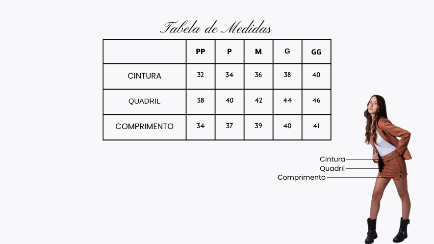 ♡ A Saia pode ser usada como cintura alta ou baixa, caso queira que a peça fique cintura baixa, escolha um tamanho maior do que você usa.